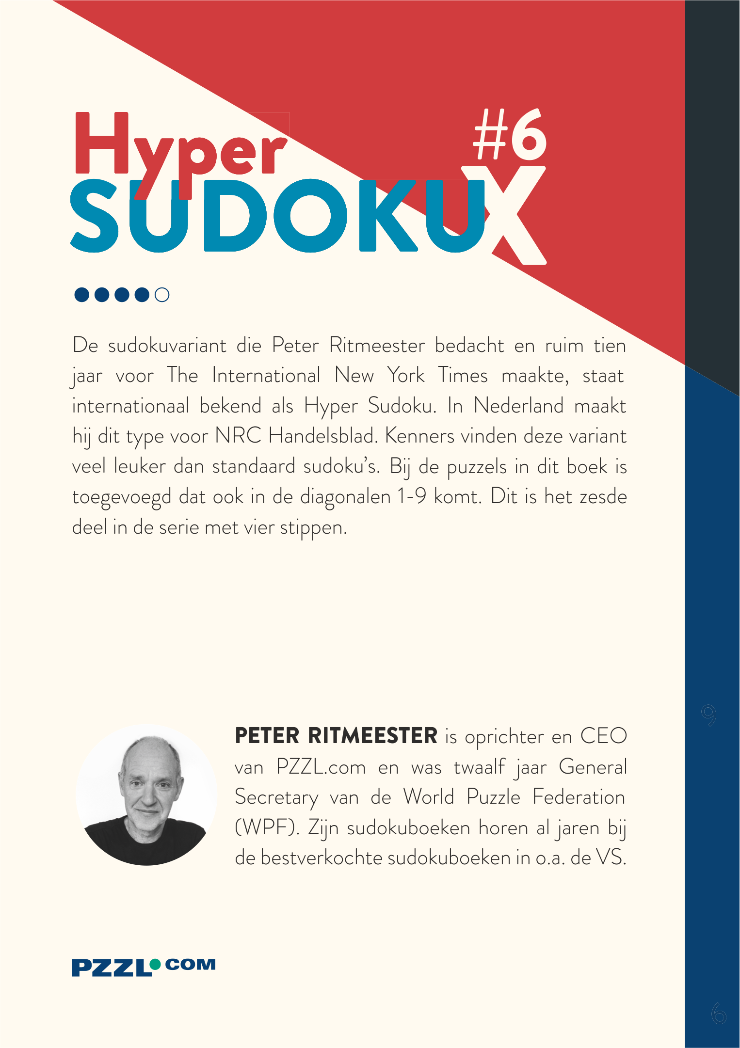 De sudokuvariant met de vier extra grijze vlakken, bekend van NRC Handelsblad, met als toevoeging dat ook in de twee diagonalen 1-9 komt. Deze puzzels zijn van het niveau van NRC op zaterdag of iets lastiger: veel puzzels hebben maar 12 of 13 gegeven cijfers. Inclusief uitgebreide handleiding met oplossingstips. Dit is deel 6 van de serie met 4 stippen.